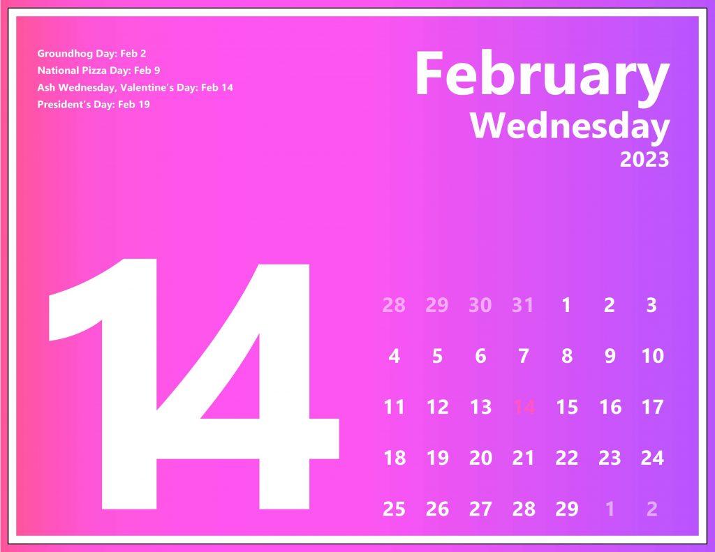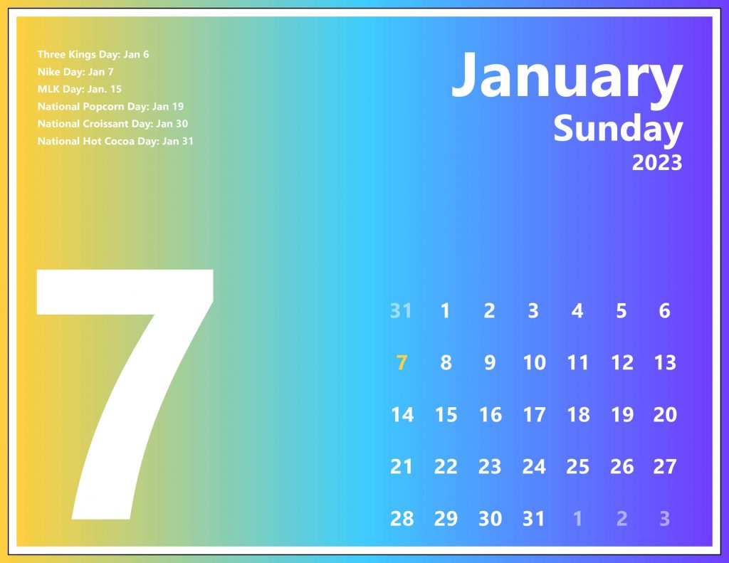 A hypothetical calendar I made for my Typography class in 2023. I love how colorful it came out with the gradients.
